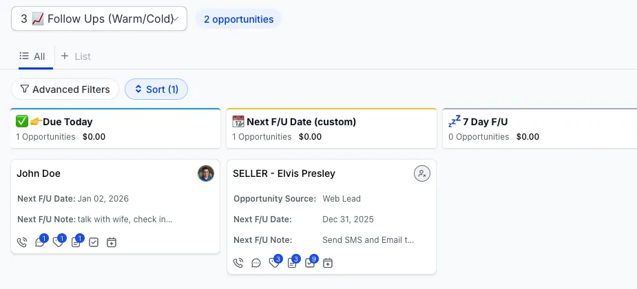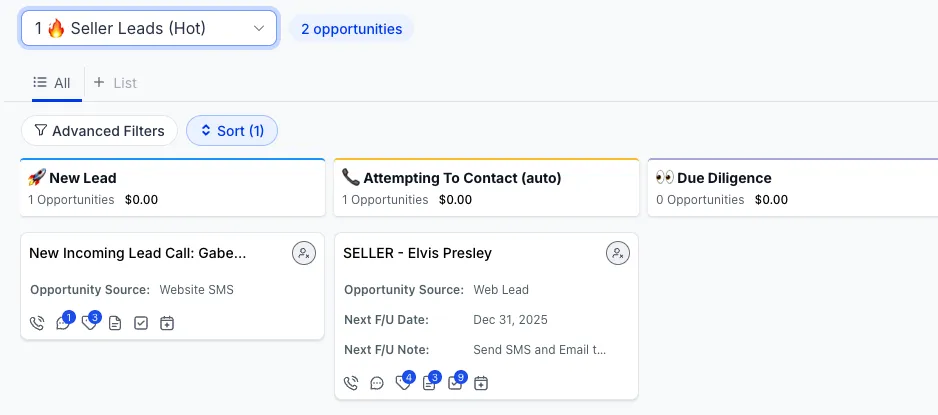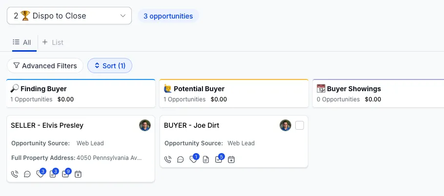 Clear pipelines for seller leads, dispo, and follow ups